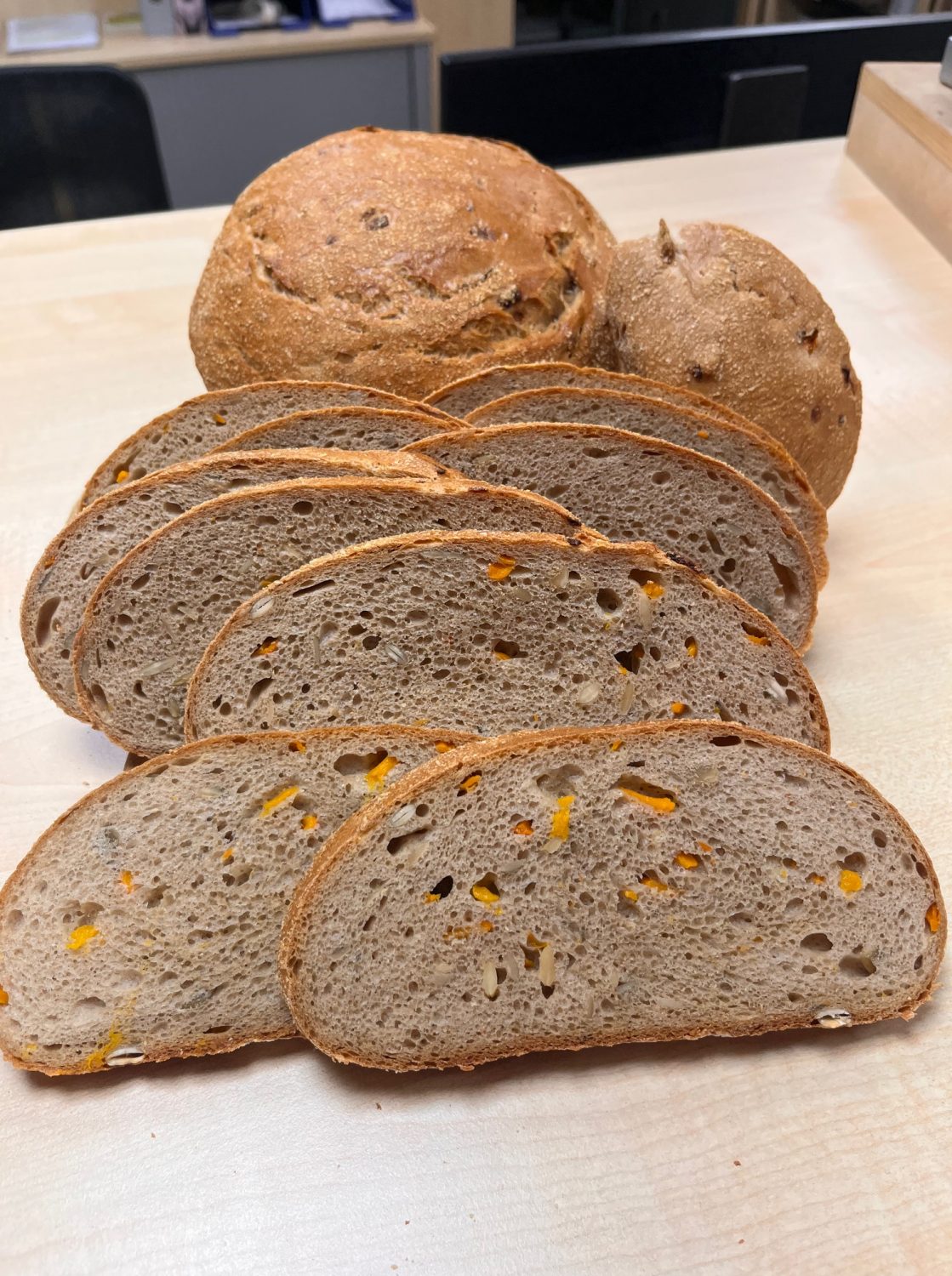 Herrlich saftiges Weizenmischbrot mit Kürbisstiften.